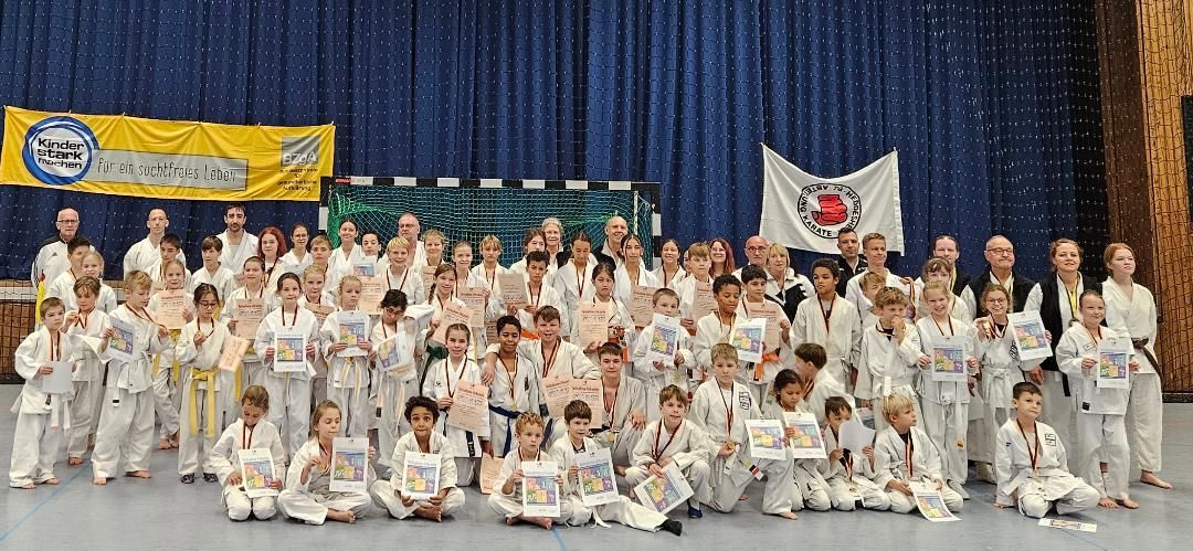 Am Samstag, den 11. November 2023 startete mit ca. 65 Kindern um 10 Uhr das jährliche Kinder- Fördertraining mit Helmut Spitznagel. Das neue Jahres- Fördertraining unter dem Motto : "Kindgerechtes Kognitions-, Koordinations- und Technik-Training“ begann direkt mit neuen Eindrücken und interessanten Impulsen. Übungsbeispiele in den folgenden Themenbereiche wurden an diesem Tag besprochen und ausprobiert: - Grundlegende Motorik- und Rhythmus-Schulung - Kognitives Training - "Beweg Dein Gehirn" - Lernen in Teilbewegungen - Propriozeptives Training für Kinder - Didaktik und Methodik im Kata-Training sowie - Konditions-Training mit Trainings-Hilfsmitteln wie z.B. Teppichfließen, Springseile und Langbank. Nicht nur die Kinder konnten einen neuen Einblick in das moderne Trainingsprogramm erhalten, auch die Trainer wurden mit neuen Möglichkeiten qualifiziert. Nach einem erfolgreichen Trainingstag wurden alle Kinder mit einer Urkunde und einer Medaille belohnt. Bericht verfasst von Melanie Beisheim